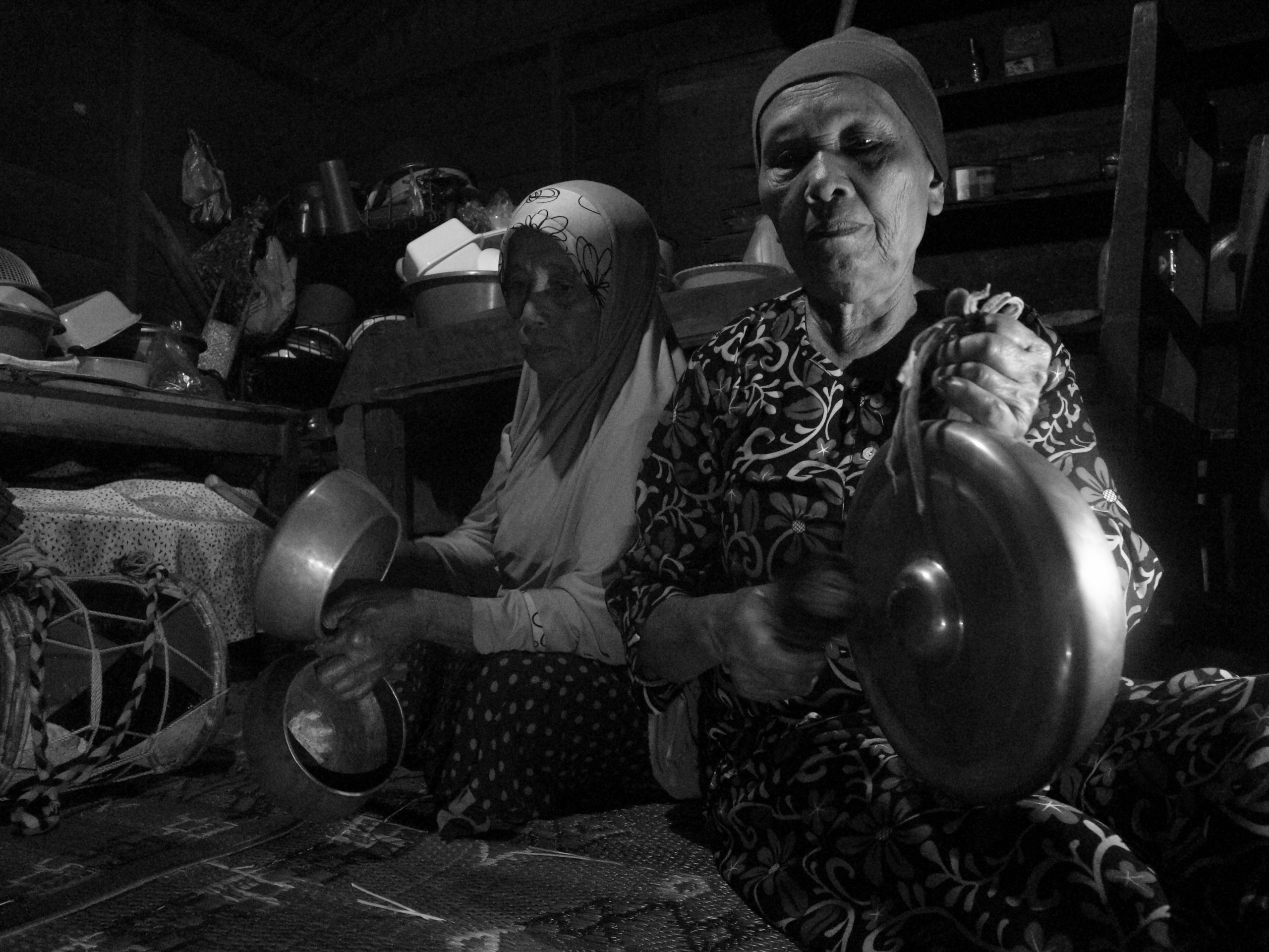 Di sudut dapur yang cukup sesak oleh kayu-kayu, peralatan dapur, tungku, serta jelaga-jelaga yang bergelayutan di selayan. Kesemua itu, menjadi saksi atas bunyi-bunyi tradisi yang kerap diperdengarkan oleh ibu Asria atau yang biasa dipanggil Mak Upiak, berdua dengan mak Ceni. Dua perempuan 60 tahun lebih ini yang memang menjadi ujung tombak kelompok ansambel Talempong Pacik…